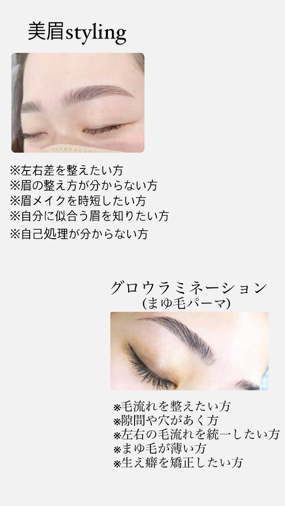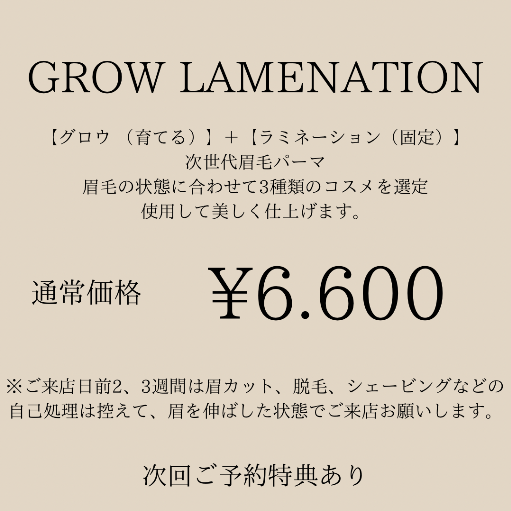 Grow Lamination(眉毛パーマ) *左右の毛流れを統一することができる! *眉の濃さを統一することができる! *美眉スタイリングだけでは整えることが難しい毛流れの矯正ができる! *眉メイクの時間が短縮できる! ※美眉スタイリングと組み合わせすることで、より完璧な仕上がりに!