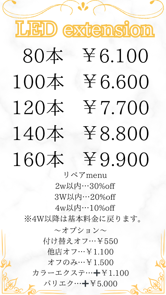 まつエク本数料金➕¥3.850(美眉)まつエク本数料金➕¥6.050(眉毛パーマ)まつ毛パーマ➕美眉¥10.000まつ毛パーマ➕眉毛パーマ¥12.000